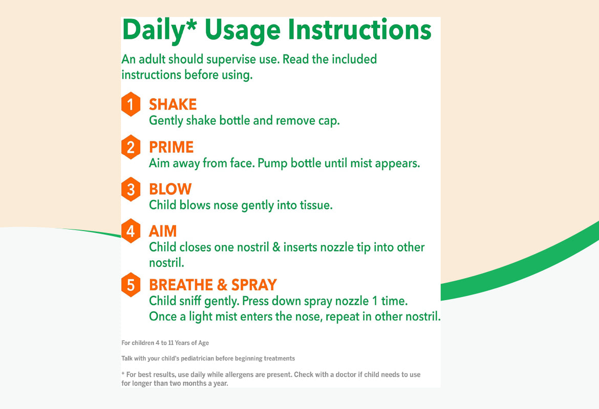 Read the quick start guide for how to: prime the bottle, use the spray, clean the spray nozzle. Shake gently before each use. Use this product only once a day. Do not use more than directed. Adults and children 12 years of age and older: Week 1 - use 2 sprays in each nostril once daily. Week 2 through 6 months - use 1 or 2 sprays in each nostril once daily, as needed to treat your symptoms.